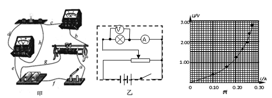 F.滑动变阻器:0~20 Ω,额定电流2A G.导线,电键 (1)为了使测量结果较准确,应选用的器材有? ________ .(填仪器的字母代号) (2)在虚线框内画出实验电路图 ![]() (3)因系统误差的存在,本实验所得的测量值与真实值相比E测(?)E真, r测 (?)r真(括号内填“大于”、“小于”或“等于” ) 参考答案:(1)ADFG (2)如图(3)小于,小于 本题解析:(1)电动势约为4.5 V,则电压表应选择D。电流 本题难度:一般 4、计算题 在“描绘额定电压为2.5V的小灯泡的伏安特性曲线”实验中,用导线a、b、c、d、e、f、g、h按图(甲)所示方式连接电路,电路中所有元器件都完好. 参考答案:①请根据实验连接电路图在图(乙)中虚线框内画出实验原理图;(3分)②? g?(2分) 本题解析:①根据实验连接电路图分析为分压式和外接法,原理图如图;②由题意知电流表和电压表始终有示数但不能调零,故只有g导线断路;③根据表中的实验数据用平滑的曲线连接成图线;④由闭合电路欧姆定律 本题难度:一般 5、实验题 (6分)某同学用一个定值电阻R、两个开关、一个电压表和若干导线连成一个测量电源内阻的实验电路,如图所示,已知电压表的内阻远大于电源的内电阻和R,其量程大于电源电动势,表盘上刻度清晰,但数字不清,电源内阻约为几欧。 参考答案:(1) 本题解析:(1)根据实验的实物连图,画出实验电路图如图所示。 本题难度:一般 |