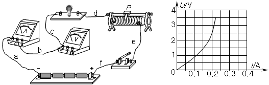 2、实验题 在做“描绘小灯泡的伏安特性曲线”实验时,所用器材有:电动势为6V的电源,额定电压为2.5V的小灯泡,以及符合实验要求的滑动变阻器、电表、开关和导线。要求能测出尽可能多组数据,如图是没有连接完的实物电路。(已连接好的导线有a、b、c、d、e、f六根)