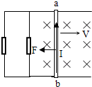 2、简答题  如图中,金属棒ab?置于水平放置的导轨上向右作切割磁感线运动.请标出流过金属棒ab的电流方向,以及ab棒受安培力的方向.