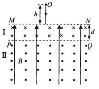 1、计算题 如图所示,空间区域I、II有匀强电场和匀强磁场,MN、PQ为理想边界,I区域高度为d,II区域的高度足够大,匀强电场方向竖直向上;I、II区域的磁感应强度大小均为B,方向分别垂直纸面向里和向外。一个质量为m、带电荷量为q的小球从磁场上方的O点由静止开始下落,进入场区后,恰能做匀速圆周运动。已知重力加速度为g。