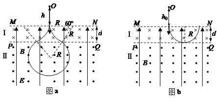 (3)当带电小球在Ⅰ区域作圆周运动的圆弧与PQ相切时,设小球释放时距MN的高度为h0,运动轨迹如图b所示