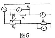 1、选择题 某同学按如图5所示的电路进行实验,实验时该同学将滑动变阻器的滑动触头P移到不同位置时测得各电流表的示数不同、各电压表的示数也不同,已知图中的电压表和电流表均为理想表。由于电路中有一处发生故障,发现两电压表示数相同了(但不为零),若这种情况的发生是由用电器引起的,则可能的故障原因是(?)