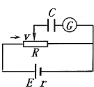 5、简答题  如图所示,将电动势E=1.5V、内阻r=0.5Ω的电源,与一粗细均匀的电阻丝相连,电阻丝的长度L=0.3m,电阻R=100Ω,当滑动片以v=5×10-3m?s-1的速度向右滑动时,电流表G的读数为多少?并指出电流表的正负极,已知电容器的电容C=2μF.