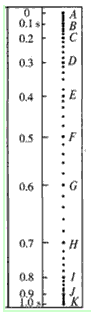 5、实验题 利用打点计时器研究一个约1.4m高的商店卷帘窗的运动,将纸带粘在卷帘底部,纸带通过打点计时器随帘在竖直面内向上运动。打印后的纸带如图所示,数据如表格所示。纸带中AB、BC、CD……每两点之间的时间间隔为0.10s,根据各间距的长度,可计算出卷帘窗在各间距内的平均速度v平均。可以将v平均近似地作为该间距中间时刻的即时速度v。