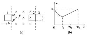 5、选择题 如图(a)所示,在光滑水平面上用恒力F拉质量为m的单匝均匀正方形铜线框,线框边长为a,在1位置以速度v0进入磁感应强度为B的匀强磁场并开始计时,若磁场的宽度为b(b>3a),在3t0时刻线框到达2位置,速度又为v0,并开始离开匀强磁场. 此过程中v-t图像如图(b)所示,则( )