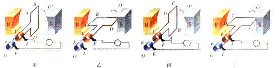 ![]() 2、选择题 如图所示,一矩形线圈在匀强磁场中以角速度4π rad/s匀速转动,产生的交变电动势的图象如图,则(?) 3、填空题 下图是交流发电机的示意图。为了清楚,老师只画出了一匝线圈(实际共有N匝)。线圈AB边(长l1)连在金属环K上,CD边(长也为l1)连在滑环L上;导体做的两个电刷E、F分别压在两个滑环上,线圈在转动时可以通过滑环和电刷保持与外电路的连接。假定线圈沿逆时针方向以角速度ω0匀速转动,如图甲至丁。(左边为N极,右边为S极;外面是K环,里面是L环) 4、简答题 如图所示,在匀强磁场中有一个“∩”形导线框可绕AB轴转动,已知匀强磁场的磁感强度大小B=