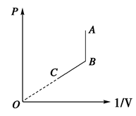 2、选择题 如图所示,为一定质量的理想气体的p-1/V图象,图中BC为过原点的直线,A、B、C为气体的三个状态,则下列说法中正确的是( )