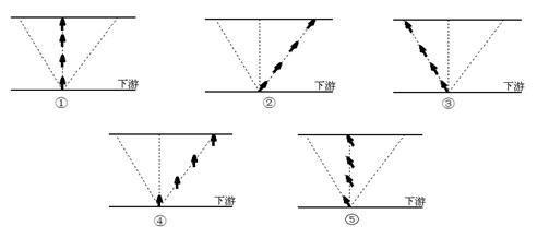 1、选择题 已知河水的流速为v1,小船在静水中的速度为v2,且v2>v1,下面用小箭号表示小船及船头的指向,则能正确反映小船在最短时间内渡河、最短位移渡河的情景图示依次是(?)