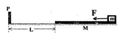 4、计算题 (20分)光滑水平面上有一质量为M="2" kg的足够长的木板,木板上最右端有一大小可忽略、质量为m=3kg的物块,物块与木板间的动摩擦因数 ,且最大静摩擦力等于滑动摩擦力。开始时物块和木板都静止,距木板左端L=2.4m处有一固定在水平面上的竖直弹性挡板P。现对物块施加一水平向左外力F=6N,若木板与挡板P发生撞击时间极短,并且搏击时无动能损失,物块始终未能与挡板相撞,求: