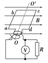 3、计算题  (2011年厦门一中月考)如图10-1-14所示,匀强磁场的磁感应强度B=0.5 T,边长为L=10 cm的正方形线圈abcd共100匝,线圈电阻r=1 Ω,线圈绕垂直于磁感线的对称轴OO′匀速转动,角速度为ω=2π rad/s,外电路电阻R=4 Ω,求: