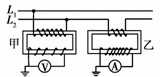 1、选择题 如图所示,L1和L2是输电线,甲是电压互感器,变压比为1000∶1,乙是电流互感器.变流比为100∶1,并且知道电压表示数为220 V,电流表示数为10 A,则输电线的输送功率为