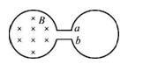3、选择题 如图所示,两个互连的金属圆环,粗金属环的电阻为细金属环电阻的二分之一.磁场垂直穿过粗金属环所在区域.当磁场的磁感应强度随时间均匀变化时,在粗环内产生的感应电动势为ε,则a、b两点间的电势差为?(?)
