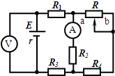 4、选择题 在如图所示的电路中,R1、R2、R3和R4皆为定值电阻,R为滑动变阻器,电源的电动势为E,内阻为r.设电流表A的读数为I,电压表V的读数为U.当滑动变阻器R的滑动头向图中b端移动时,( )