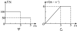 5、填空题 一木箱在水平面上受到水平推力F作用,在5s内F的变化和木箱速度变化如图中甲、乙所示,则木箱的质量为______?kg,木箱与地面间的动摩擦因数为______.(g取10m/s2)