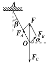 5、计算题 一盏电灯重力为G,悬于天花板上A点,在电线O处系一细线OB,使电线OA偏离竖直方向的夹角为β=30°,如图所示。现保持β角不变,缓慢调整OB方向至OB线上拉力最小为止,此时OB与水平方向的夹角α等于多少?最小拉力是多少?