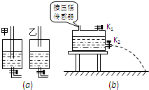 某同学根据这一现象,猜测水流速度可能与水面上空气的压强有关,他为了验证这一猜想,设计了如图(b)所示的装置,阀门K2控制的容器底部出水小孔是水平的.利用阀门K1可以改变密闭容器内水面上方气体的压强,利用平抛运动知识可获得K2刚打开时流出水的初速度.在一次实验中水深h=1m保持不变的情况下,测出水刚流出时的初速度和对应的水面上气体压强的数据记录如下表所示:
