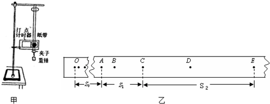 (2)如图(乙)所示,根据打出的纸带,选取纸带上打出的连续五个点A、B、C、D、E,测出A点距起始点O的距离为s0,点A、C间的距离为s1,点C、E间的距离为s2,使用交流电的频率为f,已知重锤的质量为m,当地的重力加速度为g,则起始点O到打下C点的过程中,重锤重力势能的减少量为△EP=______,重锤动能的增加量为△EK=______.利用这个装置也可以测量重锤下落的加速度a的数值,则根据这些条件和数据计算重锤下落的加速度a的表达式:a=______.
