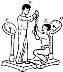 1、选择题 如图所示,质量均为m的甲、乙两同学,分别静止于水平地面的台秤P、Q上,他们用手分别竖直牵拉一只弹簧秤的两端,稳定后弹簧秤的示数为F,若弹簧秤的质量不计,下列说法正确的是( ) A.甲同学重力增加,乙重力减小 B.台秤P的读数等于mg-F C.台秤Q的读数为mg-2F D.两台秤的读数之和为2mg