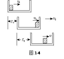 小题2:从木块开始运动到相对木盒静止的过程中,木盒的运动分三个阶段:第一阶段,木盒向右做初速度为零的匀加速运动;第二阶段,木块与木盒发生弹性碰撞,因两者质量相等,所以交换速度;第三阶段,木盒做匀减速运动,木盒的总位移等于一、三阶段的位移之和.为了求出木盒运动的位移,我们画出状态示意图,如图1-4所示.
