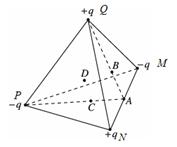 ,A.B.C.D三点都位于M和N的中垂面上,由于M和N是两个等量异种点电荷,所以M和N在A.B.C.D的电势相等;A.D两点在P和Q的中垂面上,P和Q是等量异种点电荷,所以中垂线电势相等,所以