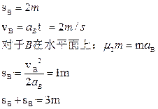 4、计算题 如图所示,厚度不计的薄板A长L=5.0m,质量M=5.0kg,放在水平桌面上,板的右端与桌边相齐。在A上距右端s=3.0m处放一物体B(大小不计),其质量m=2.0kg,已知A、B间的动摩擦因数μ=0.1,A与桌面间和B与桌面间的动摩擦因数μ=0.2,原来系统静止。现在在板的右端施加一大小一定的水平力F=26N,持续作用在A上,将A从B下抽出。(g=10m/s2)求: