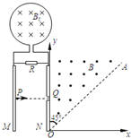 5、简答题 如图所示,一面积为S单匝圆形金属线圈与阻值为R的电阻连结成闭合回路,不计圆形金属线圈及导线的电阻.线圈内存在一个方向垂直纸面向内、磁感应强度均匀增加且变化率为k的磁场Bt.电阻两端并联一对平行金属板M、N,N板右侧xOy坐标系(坐标原点O在N板的下端)的第一象限内,有垂直纸面向外的匀强磁场,磁场边界OA和y轴的夹角∠AOy=45°,AOx区域为无场区.在靠近M板处的P点由静止释放一质量为m,带电量为+q的粒子(不计重力),经过N板的小孔,从Q(0,a)点垂直y轴进入第I象限,经OA上某点离开磁场,最后垂直x轴离开第I象限.求: