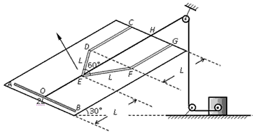 。一根质量为m的导体棒AB在电机牵引下,以恒定速度V0沿OH方向从斜面底端开始运动,滑上导轨并到达斜面顶端,AB⊥OH。金属导轨的CD、FG段电阻不计,DEF段与AB棒材料与横截面积均相同,单位长度的电阻为r,O是AB棒的中点,整个斜面处在垂直斜面向上磁感应强度为B的匀强磁场中。求: