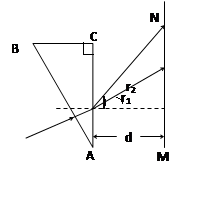 ![]() 参考答案:A、在河岸上观察水中的鱼,所看到的鱼的位置比实际位置偏高的现象,这是由于光的折射现象引起的.故A错误. 本题解析: 本题难度:简单 2、选择题 如图,有一截面是直角三角形的棱镜ABC,∠A=30?.它对红光的折射率为n1.对紫光的折射率为n2.在距AC边d处有一与AC平行的光屏。现有由以上两种色光组成的很细的光束垂直AB边射入棱镜.v1、v2分别为红光、紫光在棱镜中的传播速度,则 |