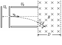 2、计算题 如图所示,一个质量为m,电荷量+q的带电微粒(重力忽略不计),从静止开始经U1电压加速后,水平进入两平行金属板间的偏转电场中,金属板长L,两板间距d,微粒射出偏转电场时的偏转角θ=30°,又接着进入一个方向垂直于纸面向里的匀强磁场区,求: