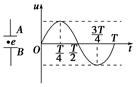 4、选择题 距离足够大的金属板A、B间有一电子(不计重力影响),在A、B间接有如图所示的正弦式电压u,t=0时电子从静止开始运动,则