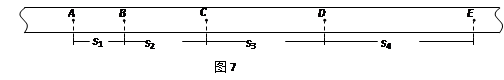 3、填空题 图7是某同学在研究小车做匀变速直线运动时,用打点计时器打出的一条纸带。图中A、B、C、D、E是按打点先后顺序依次选取的计数点,相邻计数点间的时间间隔为T。由图可知,打B点时小车的速度____________打D点时小车的速度(选填“大于”或“小于”);计数点D对应的时刻小车速度的大小为__________。