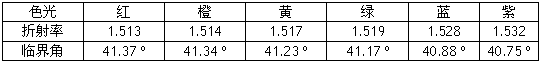 5、选择题  如图所示,截面为等腰三角形的棱镜顶角α=41.30°,一束白光以较大的入射角θ从棱镜的一侧射入,通过棱镜后从另一个侧面射出,在光屏上形成由红到紫的彩色光带。当入射角θ逐渐减小到零的过程中,请根据下表中该棱镜材料对各种色光的折射率和发生全反射的临界角,判断光屏上彩色光带的变化情况( ? )