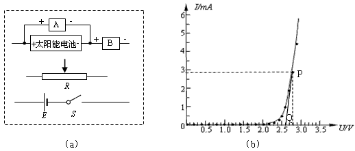 (2)该实验小组根据实验得到的数据,描点绘出了如图(b)的I-U图像,图中PQ为过P点的切线。由图可知,当电压小于2.00V时,太阳能电池的电阻______________(选填“很大”或“很小”);当电压为2.80V时,太阳能电池的电阻约为______________Ω。