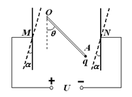 2、计算题 如图所示,竖直放置的两平行带电金属板间的匀强电场中有一根质量为m的均匀绝缘杆,上端可绕轴O在竖直平面内转动,下端固定一个不计重力的点电荷A,带电量+q。当板间电压为U1时,杆静止在与竖直方向成