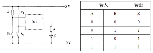 1、填空题  下图是应用某种逻辑电路制作的车门报警电路.图中的两个按钮开关分别装在汽车的两扇门上.只要任何一个开关处于开路状态(输入为逻辑1),那么输出也是逻辑1,发光二极管(警报灯)就发光.