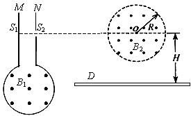 cm的圆形区域内,有一个水平方向的匀强磁场,磁感应强度大小为B2=0.1T,方向垂直纸面向外。M、N为竖直平行放置的相距很近的两金属板, S1、S2为M、N板上的两个小孔,且S1、S2跟O点在垂直极板的同一水平直线上。金属板M、N与一圆形金属线圈相连,线圈的匝数n=1000匝,面积S=0.2m2,线圈内存在着垂直纸面向外的匀强磁场,磁感应强度大小随时间变化的规律为B1=B0+kt(T),其中B0、k为常数。另有一水平放置的足够长的荧光屏D,O点跟荧光屏D之间的距离为H=2R。比荷为2×105 C/kg的正离子流由S1进入金属板M、N之间后,通过S2向磁场中心射去,通过磁场后落到荧光屏D上。离子的初速度、重力、空气阻力及离子之间的作用力均可忽略不计。问: