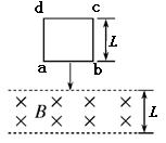 1、填空题  如图所示,电阻为R的正方形导线框abcd,边长ab=ad=L,质量为m,从某一高度自由落下,通过一匀强磁场,磁感应强度为B,磁场方向垂直纸面向里,磁场区域的宽度也为L,下落过程中线框平面始终保持在同一竖直面内,且ab边始终水平.导线框的ab边刚进入磁场就恰好开始做匀速运动,那么线框进入磁场的过程中ab两点间的电压为?.在线圈穿越磁场的全过程,线框中产生的焦耳热为?.(不考虑空气阻力,重力加速度为g)
