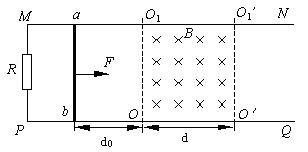 矩形区域内有垂直导轨平面竖直向下、宽为d的匀强磁场,磁感强度为B。一质量为m,电阻为r的导体棒ab,垂直搁在导轨上,与磁场左边界相距d0。现用一大小为F、水平向右的恒力拉ab棒,使它由静止开始运动,棒ab在离开磁场前已经做匀速直线运动(棒ab与导轨始终保持良好的接触,导轨电阻不计)。求: