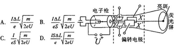 4、选择题 示波管是一种多功能电学仪器,其结构图如下图所示,电子枪中的炽热金属丝不断放出可认为初速度为零的电子,在加速电场加速,再经偏转电极xx’和YY′,最后在荧光屏上形成图象。现在偏转电极xx′和YY′上不加电压,加速电场电压为U,经加速后形成横截面积为S、电流为I的电子束。已知电子的电量为e、质量为m,则在刚射出加速电场时,一小段长为△L的电子束内电子个数是