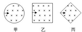 3、选择题 如图所示,甲,乙,丙分别是磁感应强度相同的圆形、正方形、正菱形(倾斜放置的正方形)匀强磁场区域(圆形直径与正方形边长及正菱形对角线长度相同)。相同带电粒子以相同速度沿垂直于磁场方向,对准中心O分别进入三个区域。则粒子分别经过三个磁场区域所用的时间由短到长顺序可能为()。
