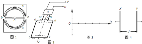 ![]() 参考答案:AB 本题解析: 本题难度:简单 4、实验题 在物理兴趣小组活动中,一同学利用下列器材设计并完成了“探究导体阻值与长度的关系”的实验。 参考答案:①电源改选E2 本题解析: 本题难度:一般 5、简答题 某种小发电机的内部结构平面图如图1所示,永久磁体的内侧为半圆柱面形状,它与共轴的圆柱形铁芯间的缝隙中存在辐向分布、大小近似均匀的磁场,磁感应强度B=0.5T.磁极间的缺口很小,可忽略.如图2所示,单匝矩形导线框abcd绕在铁芯上构成转子,ab=cd=0.4m,bc=0.2m.铁芯的轴线OO′在线框所在平面内,线框可随铁芯绕轴线转动.将线框的两个端点M、N接入图中装置A,在线框转动的过程中,装置A能使端点M始终与P相连,而端点N始终与Q相连.现使转子以ω=200π?rad/s角速度匀速转动.在图1中看,转动方向是顺时针的,设线框经过图1位置时t=0.(取π=3)
