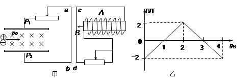 5、选择题  等离子气流由左方连续以v0射入Pl和P2两板间的匀强磁场中,ab直导线与Pl、P2相连接,线圈A与直导线cd连接。线圈A 内有随图乙所示的变化磁场。且磁场B 的正方向规定为向左,如图甲所示,则下列叙述正确的是