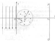 的匀强电场。在y轴右侧有一个圆心位于X轴上,半径为r=0.Olm的圆形磁场区域,磁场方向垂直纸面向里,磁感应强度B="O." 01T,在坐标为xo=0.04m处有一垂直于X轴的面积足够大的荧光屏PQ。今有一束带正电的粒子从电场左侧沿+X方向射入电场,穿出电场时恰好通过坐标原点,速度大小为