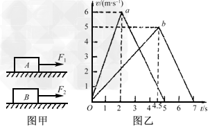 5、选择题 质量分别为m1和m2的两个物体A、B,并排静止在水平地面上,如图甲所示,用同向水平拉力F1、F2分别作用于物体A和B上,作用一段时间后撤去,两物体各自滑行一段距离后停止.两物体运动的速度-时间图象分别如图乙中图线a、b所示,相关数据已在图中标出,已知m1<m2,下列判断中正确的有
