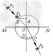 如图所示,某同学用插针法测定一半圆形玻璃砖的折射率.在平铺的白纸上垂直纸面插大头针P1、P2确定入射光线,并让入射光线过圆心O,在玻璃砖(图中实线部分)另一侧垂直纸面插大头针P3,使P3挡住P1、P2的像,连接OP3.图中MN为分界面,虚线半圆与玻璃砖对称,B、C分别是入射光线、折射光线与圆的交点,AB、CD均垂直于法线并分别交法线于A、D点. 设AB的长度为l1,AO的长度为l2,CD的长度为l3,DO的长度为l4,为较方便地表示出玻璃砖的折射率,需用刻度尺测量? (用上述给出量的字母表示),则玻璃砖的折射率可表示为?.