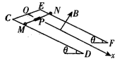 ![]() 参考答案:D 本题解析: 本题难度:一般 4、计算题 如图所示,光滑的平行金属导轨CD与EF间距为L=1 m,与水平夹角为θ=30°,导轨上端用导线CE连接(导轨和连接线电阻不计),导轨处在磁感应强度为B=0.1 T、方向垂直于导轨平面向上的匀强磁场中。一根电阻为R=1 Ω的金属棒MN两端有导电小轮搁在两导轨上,棒上有吸水装置P。取沿导轨向下为x轴正方向,坐标原点在CE中点。开始时棒处在x=0位置(即与CE重合),棒的起始质量不计。当棒自静止起下滑时,便开始吸水,质量逐渐增大,设棒质量的增大与位移x的平方根成正比,即