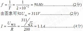 5、计算题  正弦交变电源与电阻R、交流电压表、交流电流表按照图1所示的方式连接,R=200Ω。图2是交变电源输出电压u随时间t变化的图象。则: