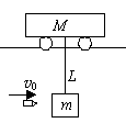 5、简答题 如图所示质量为M的天车静止在光滑水平轨道上,下面用长为L的细线悬挂着质量为m的沙箱,一颗质量为m0的子弹以v0的水平速度射入沙箱,并留在其中,在以后运动过程中