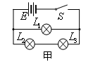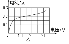 3、实验题 在如图甲所示的电路中,电源电动势为3.0V,内阻不计,L1、L2、L3为3个相同规格的小灯泡,这种小灯泡的伏安特性曲线如图乙所示。当开关S闭合后L1消耗的电功率为 W ,L2的电阻为 Ω。