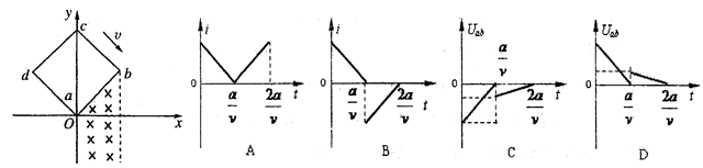 1、选择题 如下图所示,在坐标系xOy中,有边长为a的正方形金属线框abcd,其一条对角线ac和y轴重合、顶点a位于坐标原点O处.在y轴的右侧的I、IV象限内有一垂直纸面向里的匀强磁场,磁场的上边界与线框的ab边刚好完全重合,左边界与y轴重合,右边界与y轴平行.t=0时刻,线圈以恒定的速度v沿垂直于磁场上边界的方向穿过磁场区域.取沿a→b→c→d→a的感应电流方向为正方向,则在线圈穿越磁场区域的过程中,感应电流i、ab间的电势差Uab随时间t变化的图线是下图中的